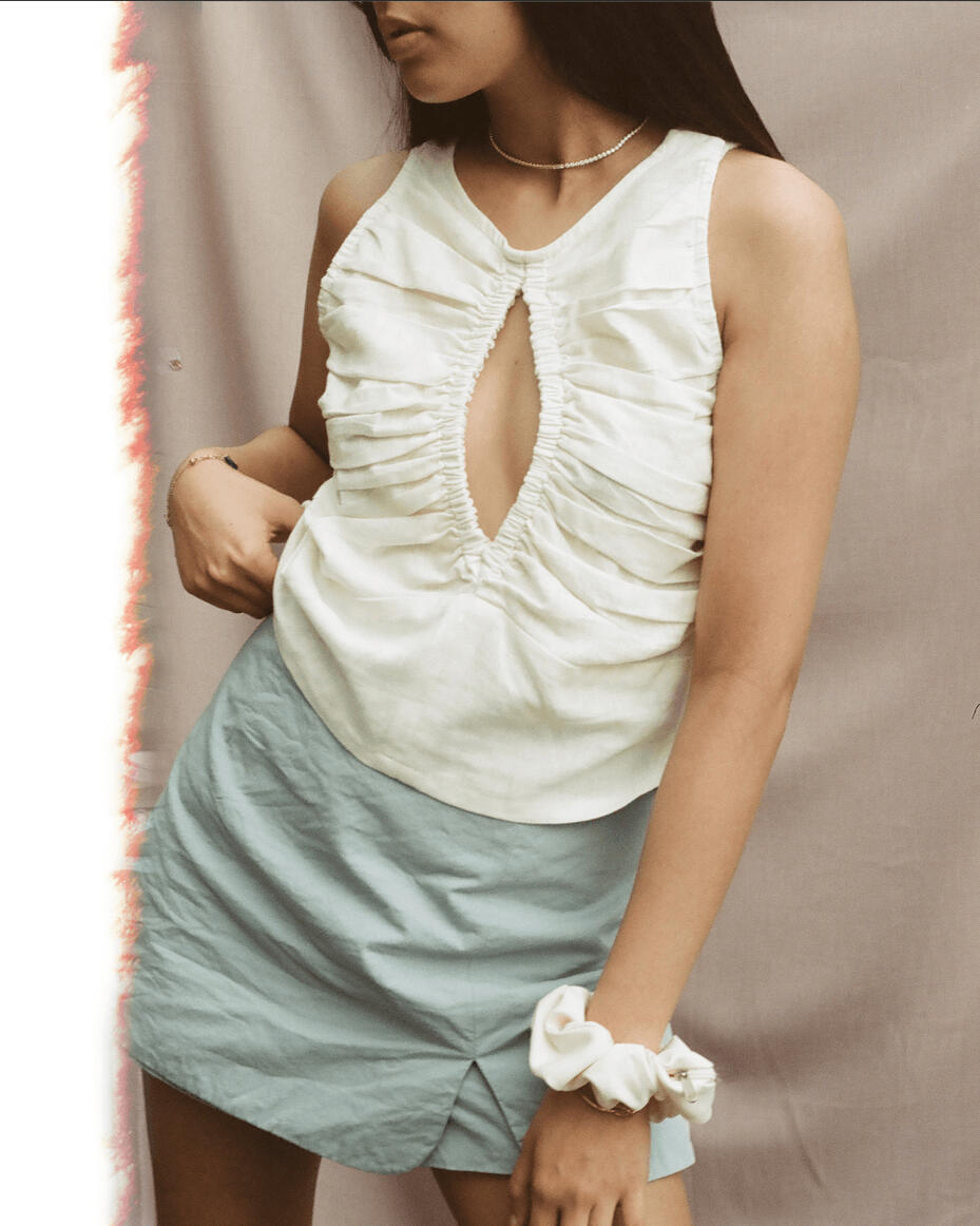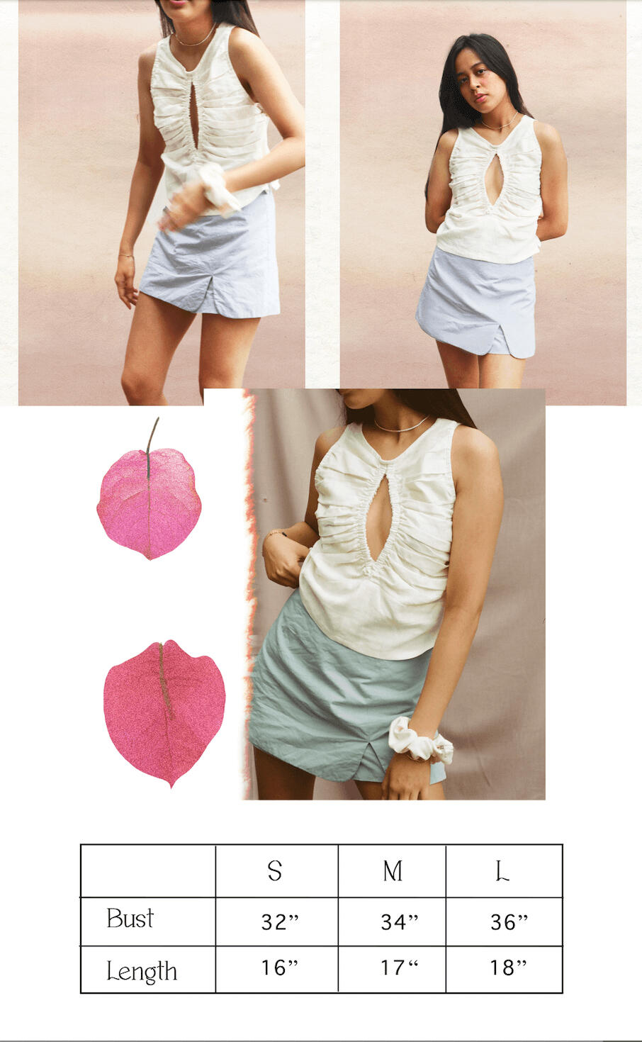 Thick square bandeau with drawstring features at the center. Straps can be tied and adjusted in multiple ways.