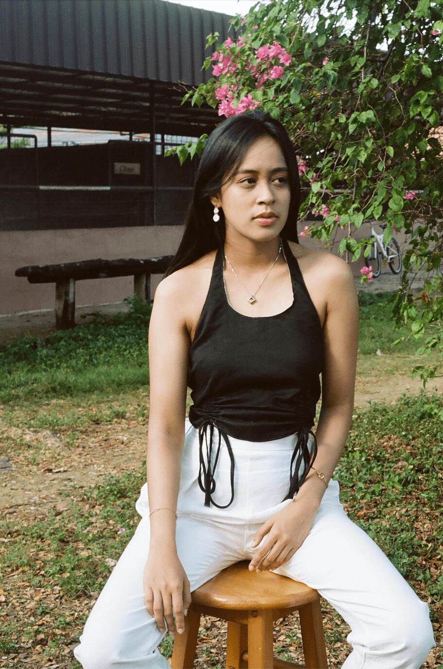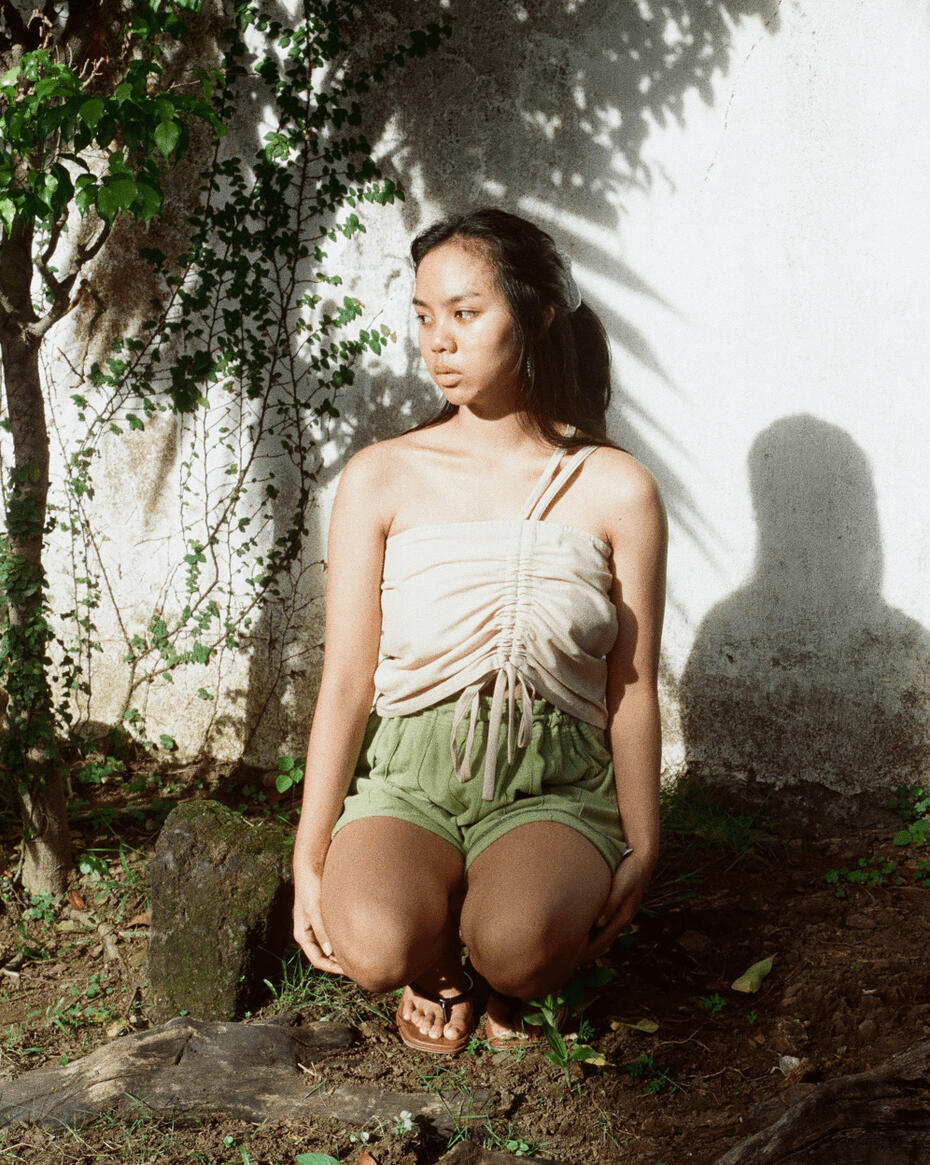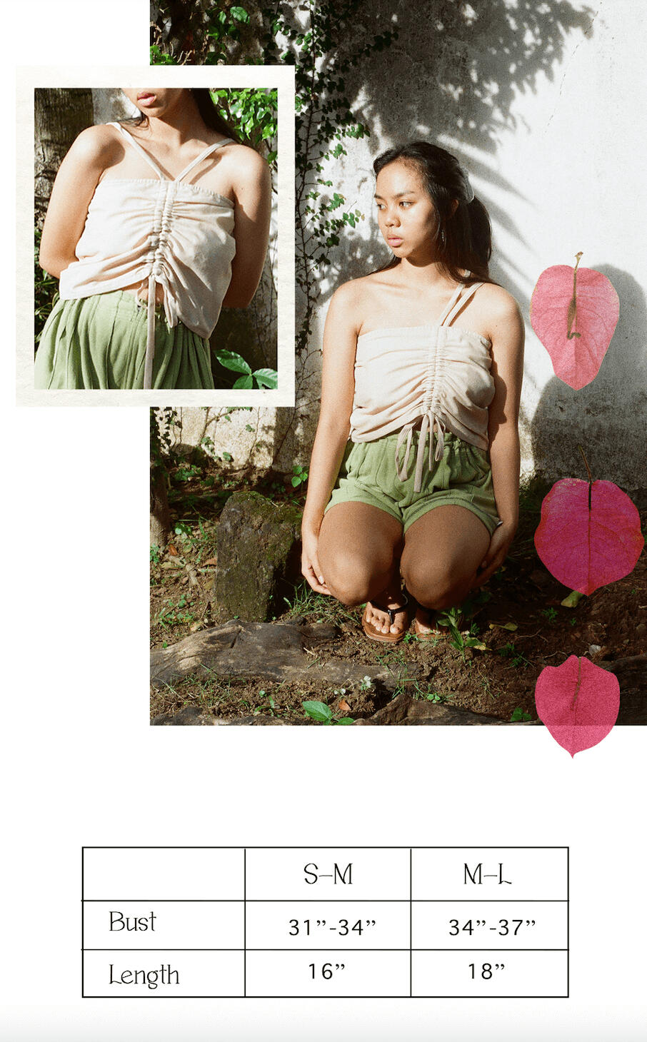Thick square bandeau with drawstring features at the center. Straps can be tied and adjusted in multiple ways.